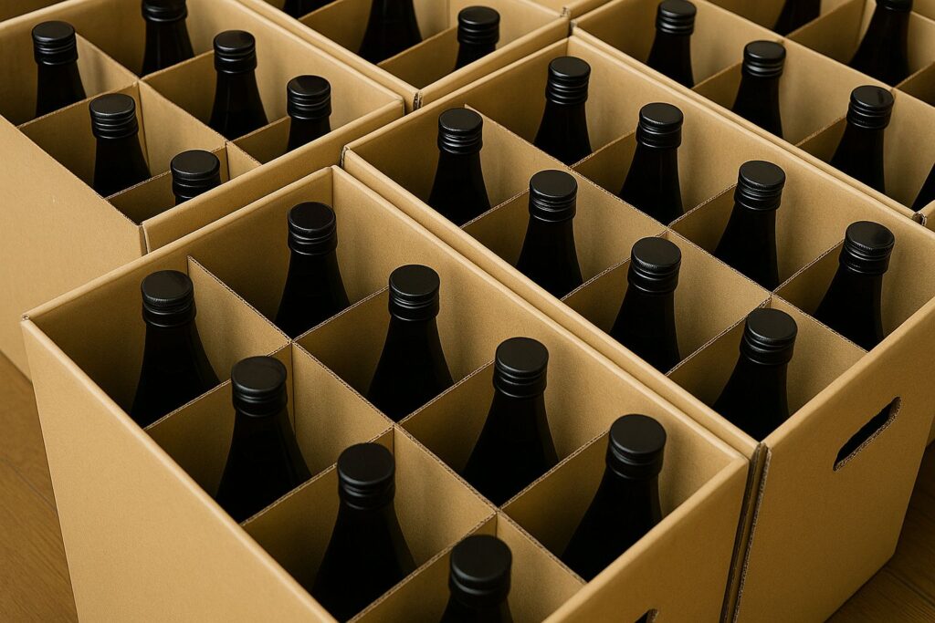 ガラス瓶の国際輸送は、専用梱包+二重箱+隙間ゼロ+耐水が基本。ボトルインナーパック(スタイロフォームやボトルシェル)を使い、瓶と瓶が触れないよう固定。外箱は強化ダンボールで、底面はH留め+十字留めの二重テープ。内容物が酒類であることを示す内部ラベルを入れつつ、外箱は過剰に目立たせないのもポイントです。