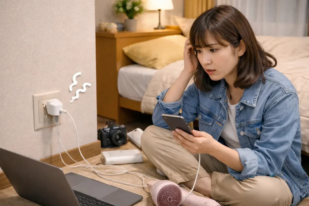 特に寮は、あなたの生活スタイルに合わせて設計されているわけじゃないので、「机の近くにない」「ベッドサイドにない」「口数が2つしかない」みたいなことが普通に起きます。さらにルームメイトがいるなら、壁の口数は実質半分になることもありますよね。だから私は、出発前の時点で電源周りを“勝ち確”にしておくのを推しています。