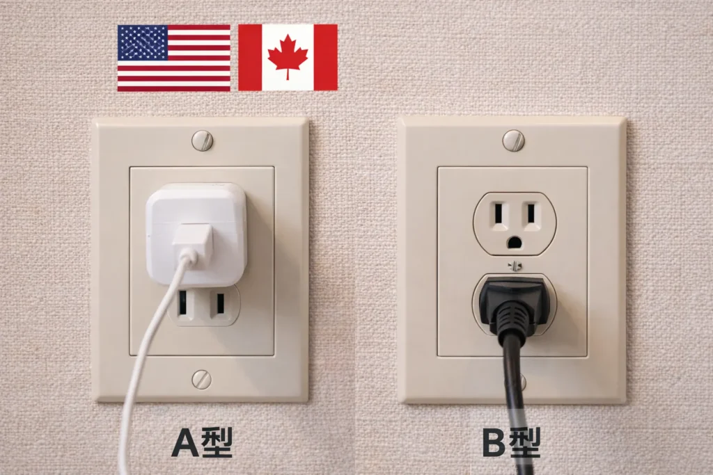 アメリカ・カナダは、日本と同じA型が使えることも多いので、形状変換が不要なケースがあります。ただし、B型(アース付きの3ピン)も一般的です。