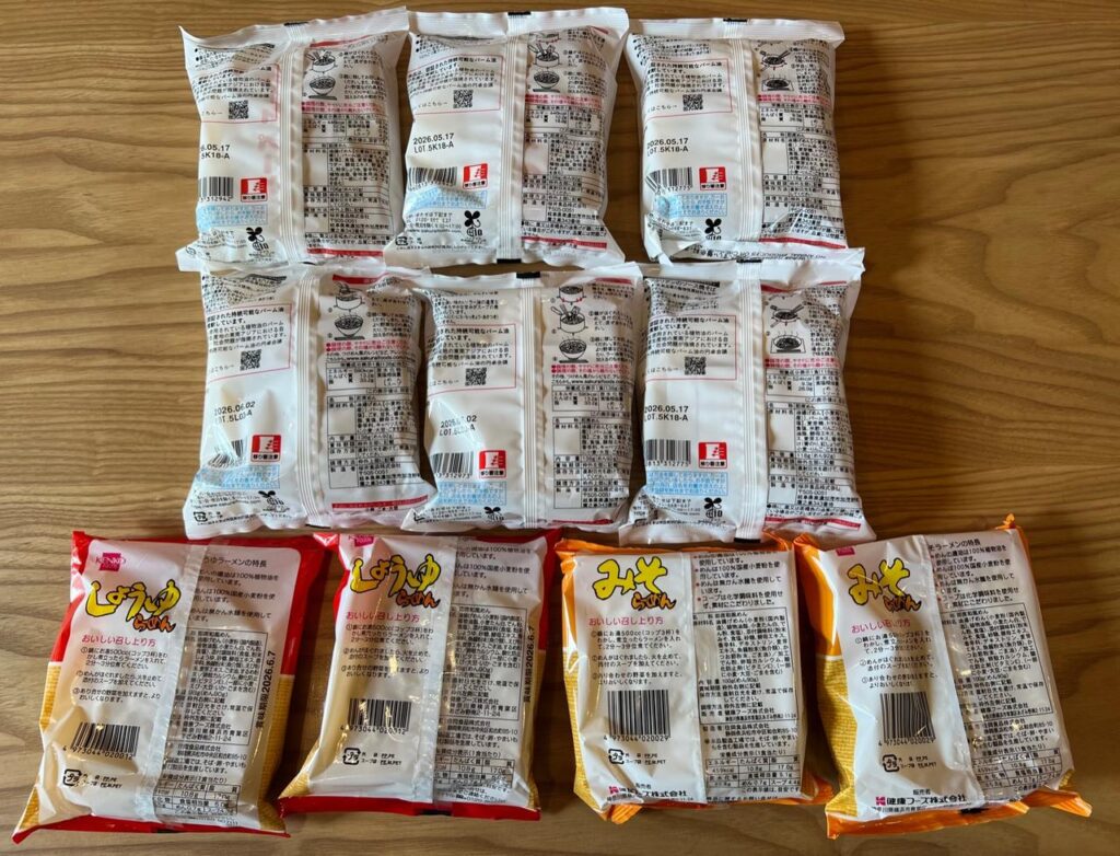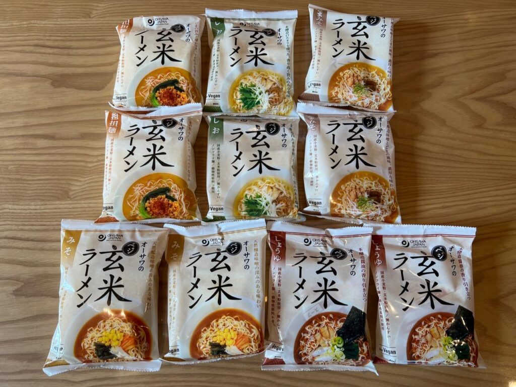 実は私、路面店を回って肉エキスを含まないラーメンを18種類集めたんです。ベジタリアンのソース焼きそば、どんこつ風ラーメン、豆乳ピリ辛麺、オーサワのベジ玄米ラーメンシリーズ(みそ、ごまみそ、しょうゆ、しお、担々麺)、ケンコウフーズの各種ラーメンなど、計37食分、総重量約5kgのアソートパックです。