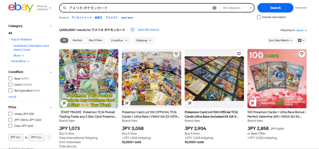 結論として、アメリカのポケモンカードを買うならeBayが一番“現実的に強い”です。理由はシンプルで、在庫量が桁違いだから。ブースター、ETB、コレクションボックス、シングル、鑑定品まで揃い、条件で絞り込めます。日本から買う人にとっては特に、買える確率の高さが最大の価値になります。