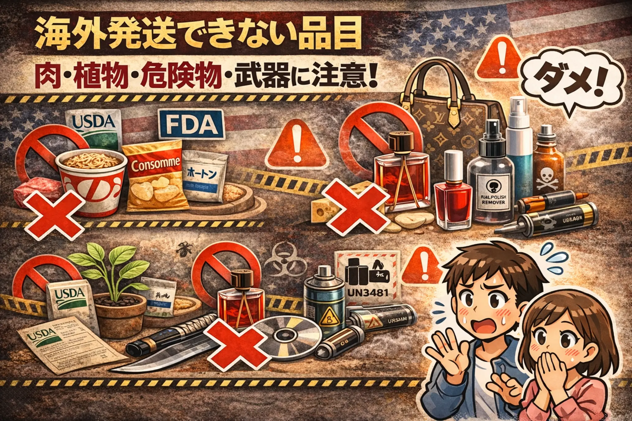 「アメリカにいる家族や友人に荷物を送りたいけど、何が送れて何が送れないの?」って、調べれば調べるほど迷子になりませんか?食品の肉エキスや乳製品の問題、液体や化粧品のルール、植物や種子の検疫規制、リチウム電池の扱い……禁制品と規制品の違いすら最初はよく分からなかったりしますよね。