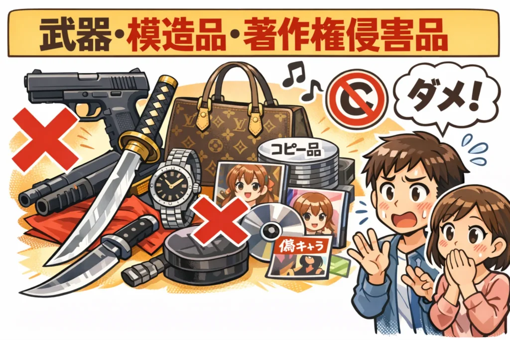 商標権・特許権・著作権などの知的財産権を侵害するコピー商品・模造品は、全面的に送れません。「自分で使うだけ」であっても、税関で没収されるだけでなく、法的な問題に発展するリスクもあります。